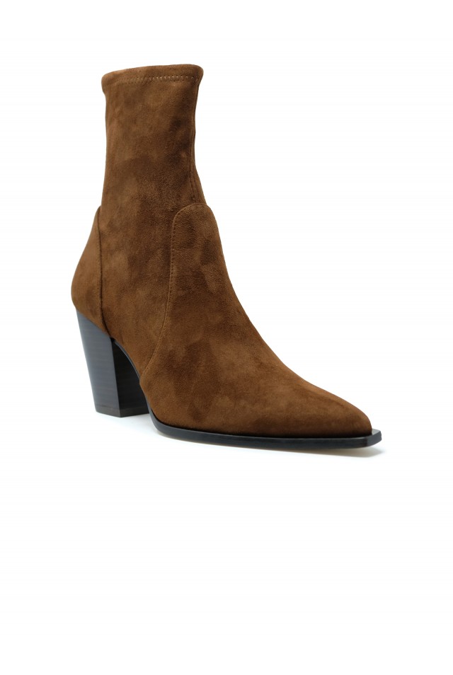 STUART WEITZMAN SM507 COFFEE SUEDE 75 JOLENE BOOTIE, product code SM507, style name JOLENE BOOTIE, color COFFEE, material SUEDE, heels 75MM, season FW25